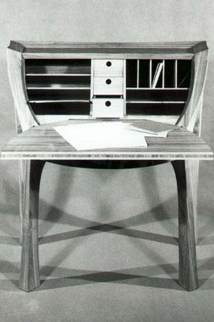 | Kölner Möbelmesse Deutscher Laubholzpreis 1984 Anerkennung Mit seinem Meisterstück erregte Gebhard Gut beim internationalen Design-Wettbewerb Deutscher Laubholzpreis erstmalig Aufsehen - von schwungvoller Gesamtanmutung, besonders liebevoller Arbeit im Detail, dem ästhetischen Reiz des ebenso zierlichen wie praktischen Möbels war die Rede. "Der Damensekretär von Gebhard Gut wird als die handwerklich schönste Arbeit des Wettbewerbs bezeichnet." ... |  |  | |